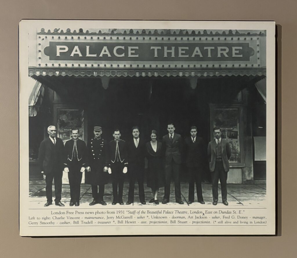 Harry Hyatt and his family built the Palace Theatre in 1929. It was said to be, “London’s first high-class neighbourhood theatre.” Hyatt, a specialist in stone construction, was also the force behind the London Life building and former City Hall. The Palace showed silent movies, the first being Synthetic Sin (1929), starring Colleen Moore. According to Cinema Treasures, the facility opened on 11 March 1929 and had a seating capacity of 879 people. The staff is pictured here, in 1931: