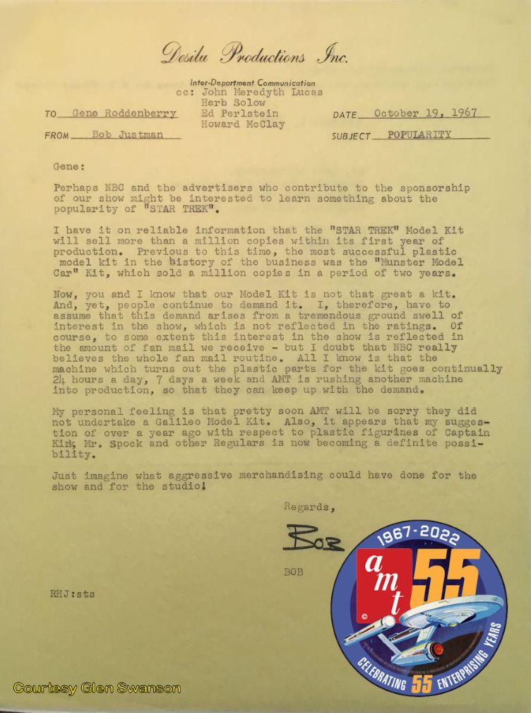 Here’s a Bob Justman memo, written during the show’s production; credit to AMT and Glen Swanson.