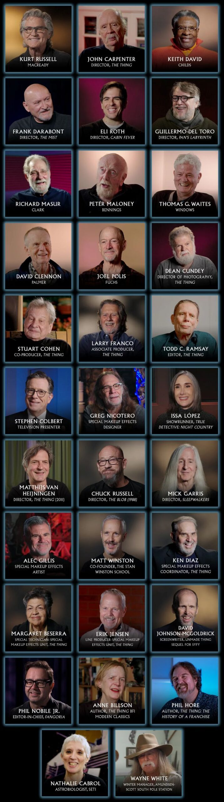 The trailer is just below. Here is the project’s official site, where you can order a copy of the documentary, which also comes with a bunch of swag. The full cast card is below the trailer. I have no connection with this project, but I wish they had interviewed me. John Carpenter and The Thing have defined and forged my creative journey and my writing career.