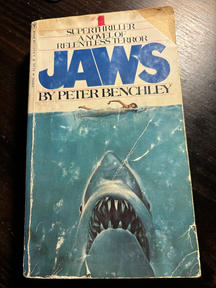 Here’s my copy of Jaws. It’s well-worn; I’ve read it at least five times. It is indeed, “A Novel of Relentless Terror,” as promised.