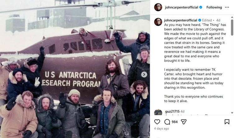 As you may have heard, “The Thing” has been added to the Library of Congress. We made the movie to push against the edges of what we could pull off, and it carries that strain in its bones. Seeing it now treated with the same care and reverence we had making it means a great deal to me and everyone who brought it to life.