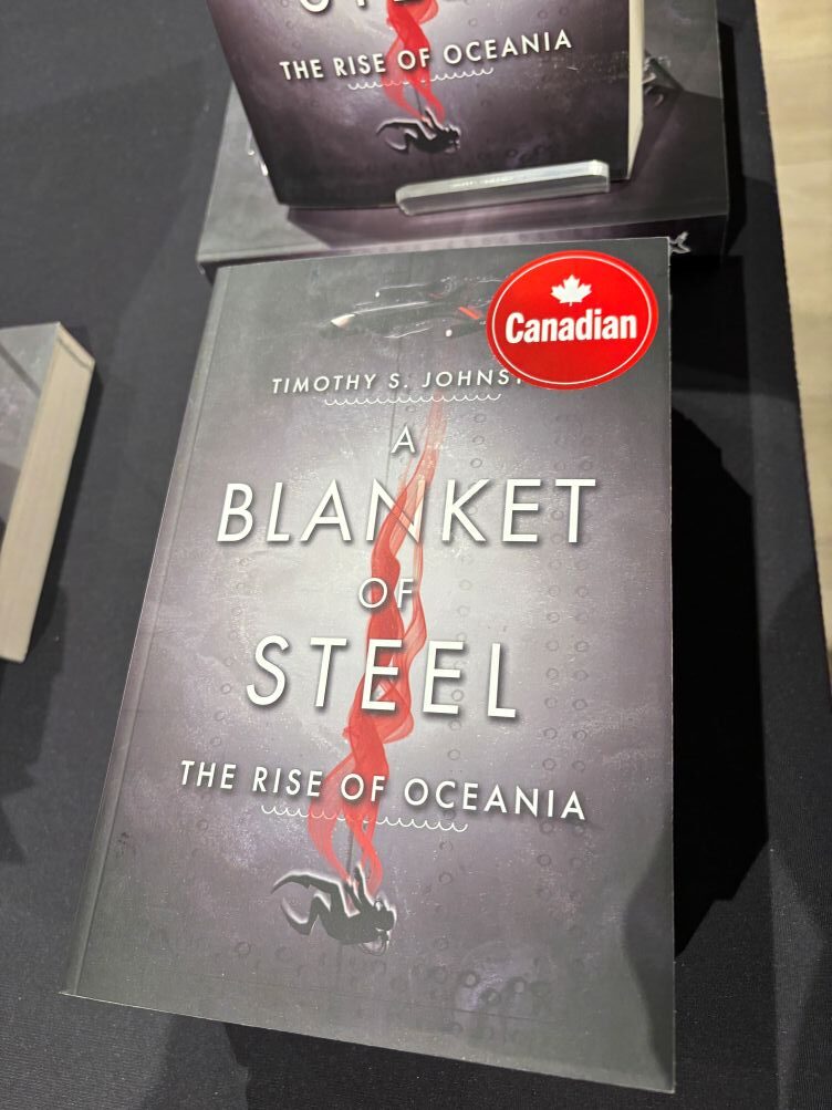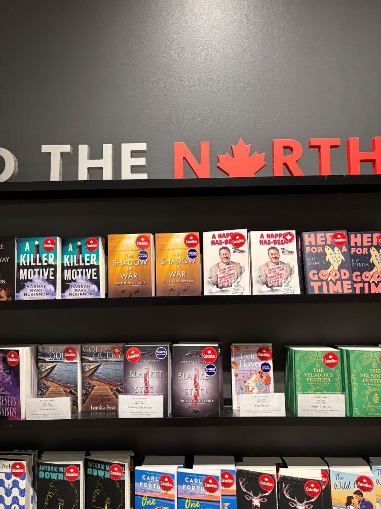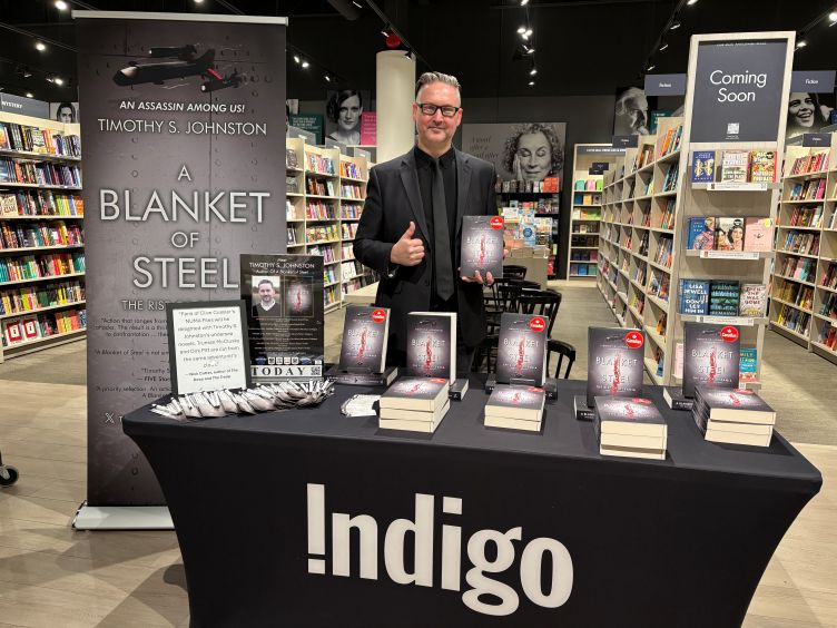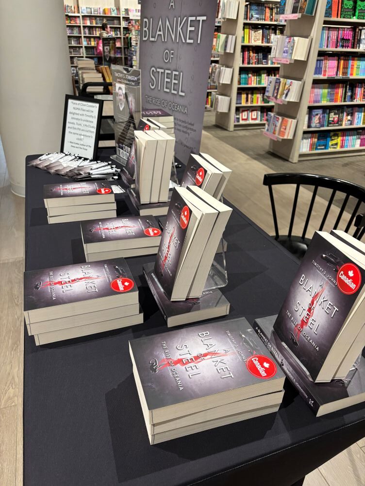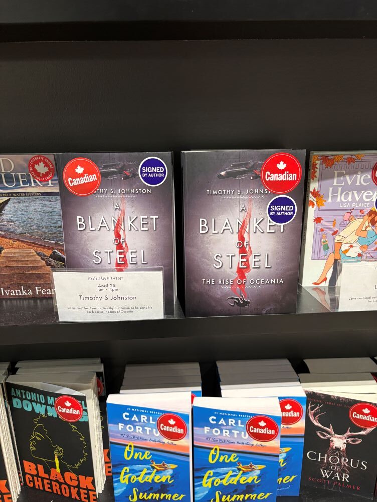 On Saturday, 25 April 2026, I travelled to Waterloo, Ontario and Conestoga Mall for a signing at the Indigo book store. I signed and sold many books to customers, chatted Thrillers and Sci-Fi, gave away swag, and connected with readers. I was promoting The Rise of Oceania, my six-book series from Fitzhenry & Whiteside, Ltd.