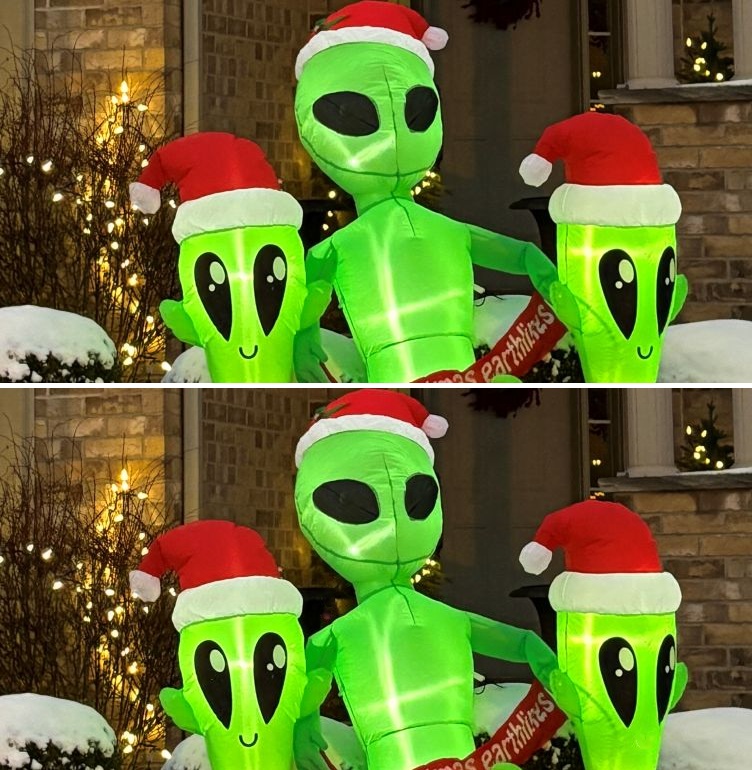 There are three differences, in increasing level of difficulty. Answers are in INVISOTEXT under the image. Merry Christmas and Happy Holidays from the Johnstons. These are some of my decorations … very on-brand, wouldn’t you say?