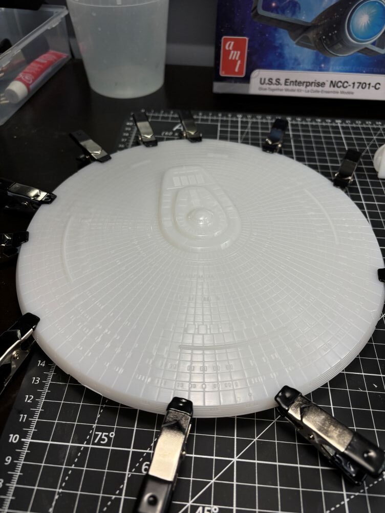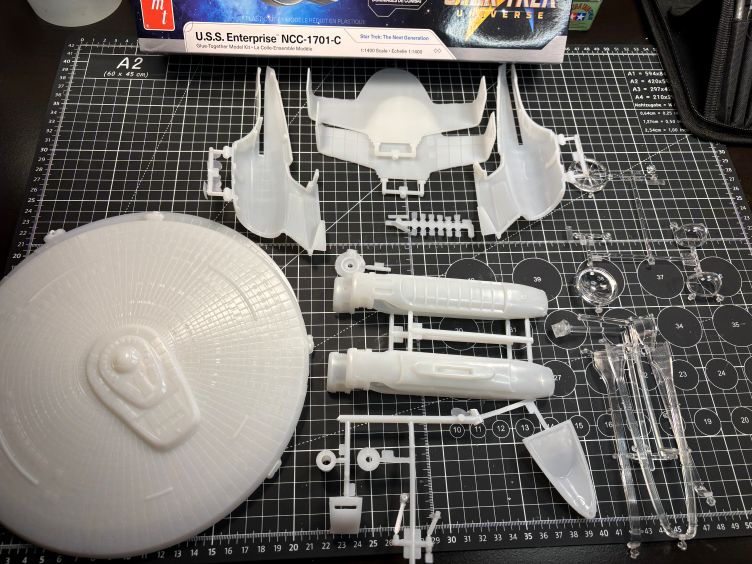 You can see there are some transparent parts if you’d like to “light” your model: the Bussard collectors, some windows, the sensor dome (at the bottom of the saucer) and so on. I haven’t achieved this level of model making, however, so I generally paint over them.