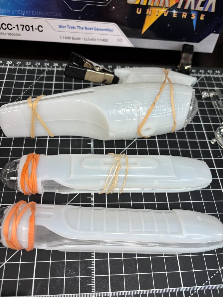 I used elastic bands for these parts because the clamps won’t go over these large hull pieces. The purpose is to hold the parts together tightly and eliminate as many gaps as possible while the glue cures. The glue actually melts the plastic together where two pieces meet.
