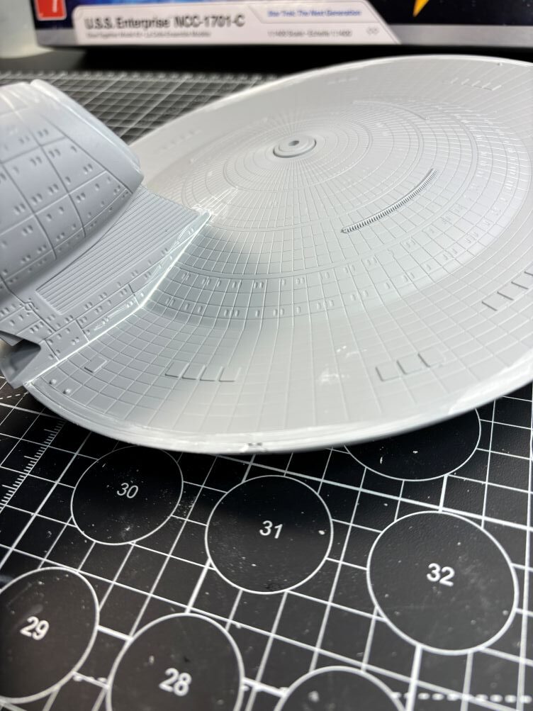 At this point, gaps have to be filled and sanded before you can prime. Note the thin gap here, between the primary and secondary hulls. Modeling putty is used to fill these areas, and then after drying overnight, it can be smoothed and sanded. It’s a white line here: