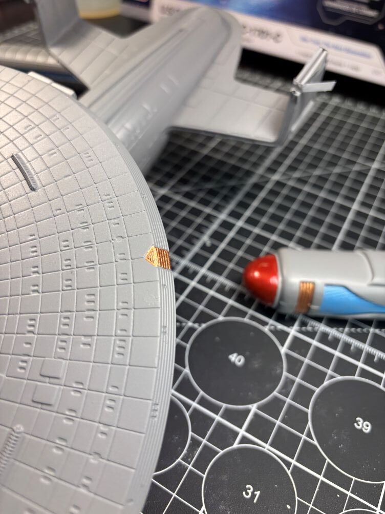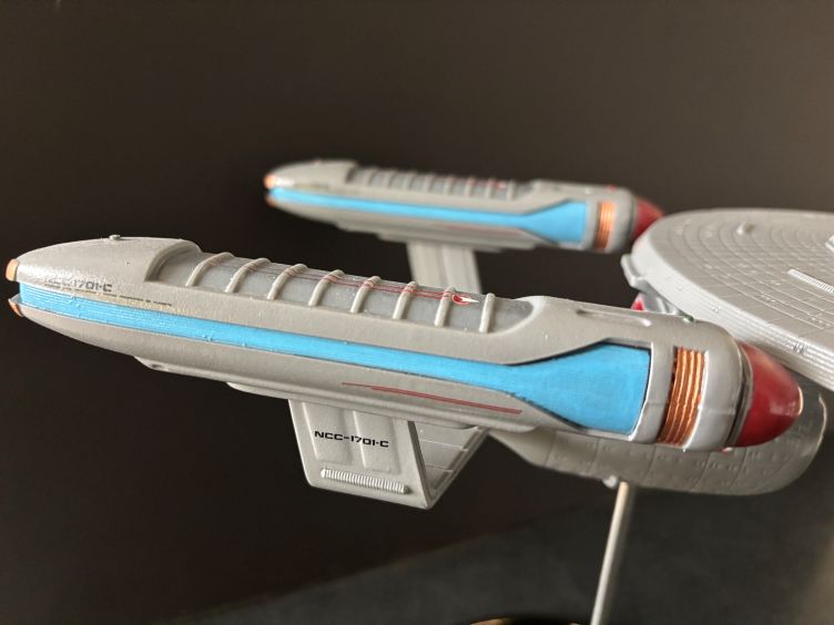 Note that I have used copper on the nacelles and saucer to match my other Trek models. In reality, the paint colour there should be yellow, but I took some liberties so my full collection has a matching aesthetic.