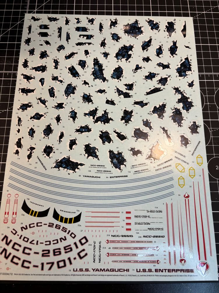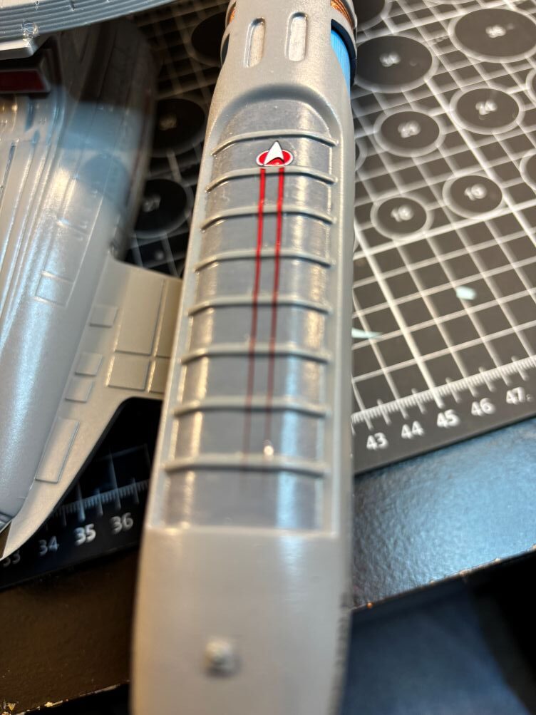 The following decal perplexed me for a while. It was on the sheet but I couldn’t figure out where it went. Then I realized … it was for a previous iteration of the model before the hole for the display pole was added. The decal is meant to stretch down the entire secondary hull at the bottom, but I had to cut it in places to make room for that hole. The end result looks stunning, don’t you think?