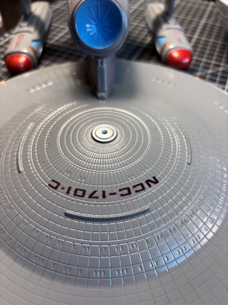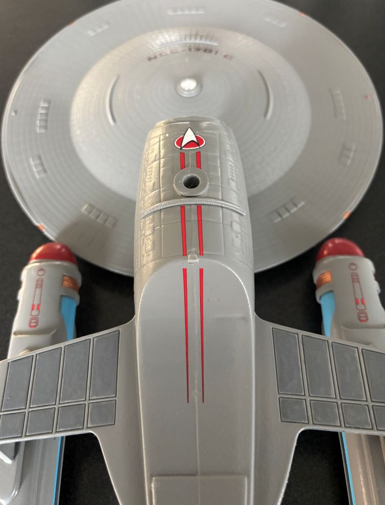 Here’s a look at the top of the ship. You can see the decals on the top of the warp nacelles and the beautiful name/registry on the saucer at the ship’s bow. I love the shuttlecraft bay and the ship’s name there too.