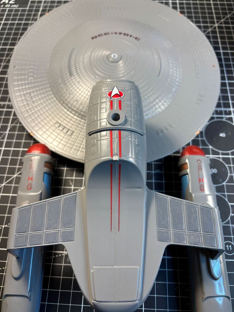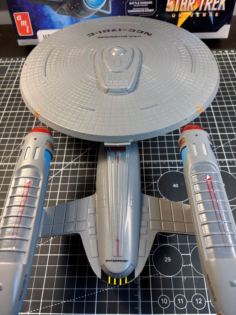 After the decals were applied and left to cure for a day, I then gave the entire model another spray of semi-gloss clear coat to get everything sealed. Here are the final “beauty” shots of AMT 1332M USS Enterprise-C: