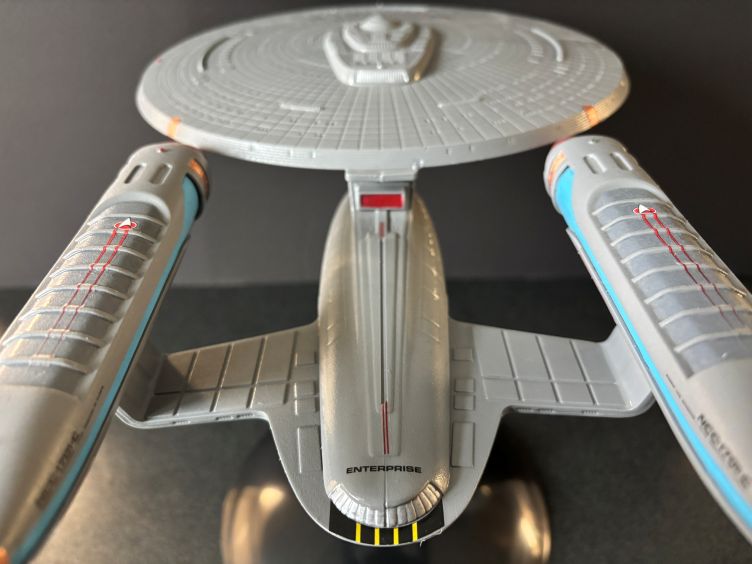 Here’s the underside of the saucer. Note the deflector “dish” is circular, which matches the TOS version of Enterprise. In Picard’s day, Enterprise-D had an oval deflector.